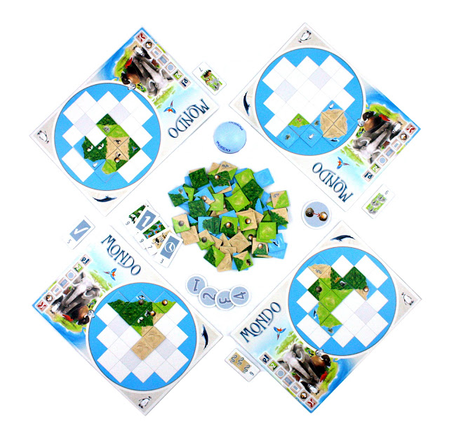 Tytuł ten przeznaczony jest dla grupy od jednego do czterech graczy, od ośmiu lat wzwyż. Jak widać zakres wiekowy łapie niemal wszystkich i słusznie, gdyż w Mondo każdy znajdzie coś dla siebie. Mondo to gra kafelkowa, w której tworzy się świat, lub przynajmniej jego niewielkiej części, gdyż celem każdego z graczy jest zbudowanie wyspy za pomocą specjalnych żetonów (kafelków). Wysepka ta może być usiana lasami, pustyniami, równinami a nawet wulkanami (aktywnymi i wygasłymi). Poza tym mogą zamieszkiwać ją różne gatunki zwierząt dzielące się na równinne, leśne oraz pustynne.